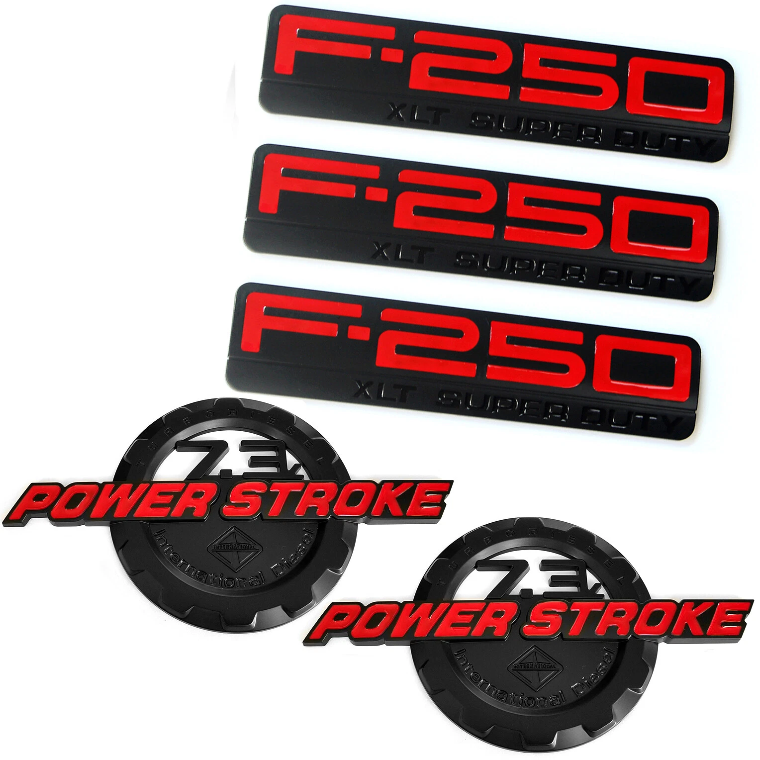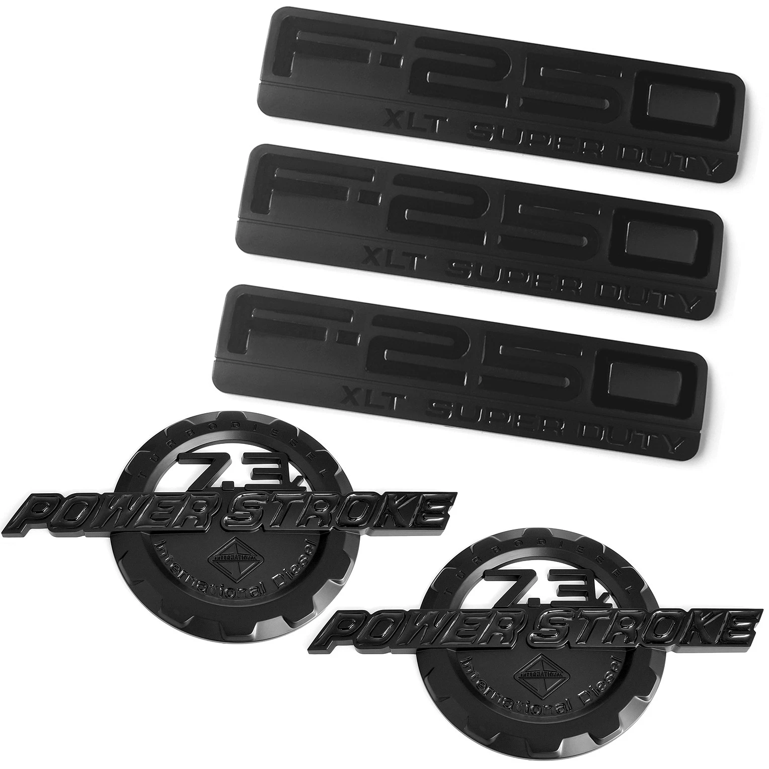 Aftermarket 5-piece 3D emblem set for F-250 7.3L Power Stroke XLT.