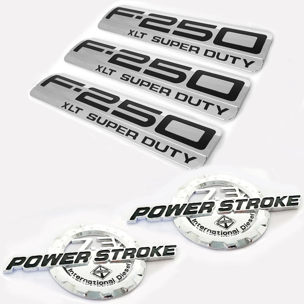 Aftermarket 5-piece 3D emblem set designed for 1999–2003 F-250 7.3L Power Stroke XLT Super Duty models. This set is intended for exterior appearance replacement and styling use and is not an OEM or factory-authorized product.