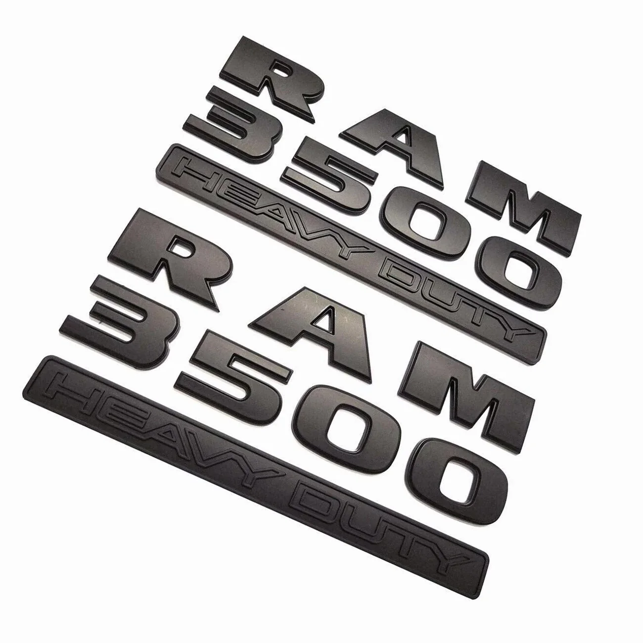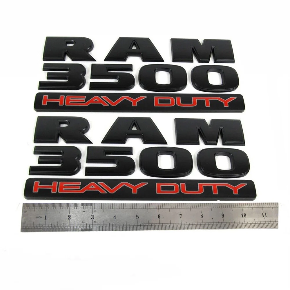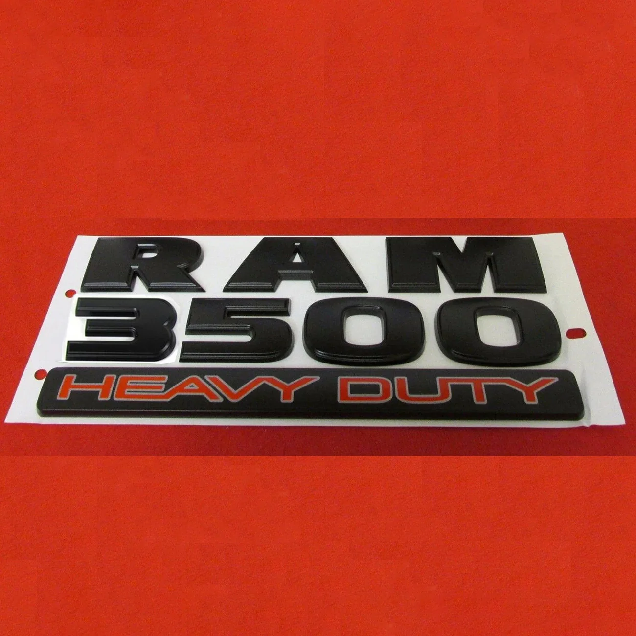 A raised 3D emblem kit designed to replace the factory “Heavy Duty & 4×4” side badges on compatible RAM 3500 trucks. Features a durable matte black finish with red accents.